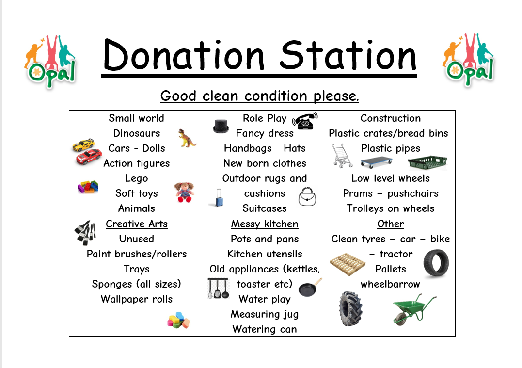 We welcome donations of safe “loose parts” (old, unwanted items). Please check items before bringing them in (no sharp edges, no batteries, no glass/polystyrene).